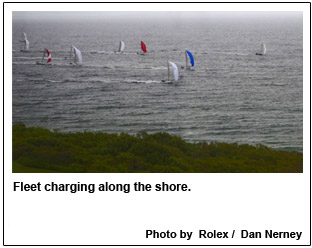 Usually it's the sailors who get an eyeful of majestic scenery while racing around the island during the Storm Trysail Club's biennial Block Island Race Week presented by Rolex, but today, spectators ashore oohed and aahed at the magnificent site of 153 boats trying to hold it together in raging winds on the Atlantic Ocean. The spectacle was best viewed from Southeast Lighthouse, perched on a 150-foot cliff at the southern-most tip of tiny Block Island, which for these five week days is serving as the epicenter of sailing in the Northeast. A mass of colorful spinnakers paralleled the shore - some of them flailing wildly during broaches and a few becoming unwanted anchors when waves rose like jaws to snag them.