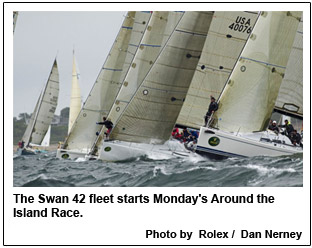 The Solent-like conditions (surely a nod from Neptune to Race Week's origins as a take-off on Cowes Week) led to several mishaps, including a man overboard (and safely recovered) on Steve and Heidi Benjamin's (Norwalk, Conn.) Tripp 41 high Noon in IRC 40A class and some hull damage (fixable by tomorrow's racing) when Chuck Townsend's (New York, N.Y./Newport, R.I.) NYYC Swan 42 Blazer apparently tried to duck Gary Jobson's (Annapolis, Md.) Mustang in a port-starboard crossing situation.