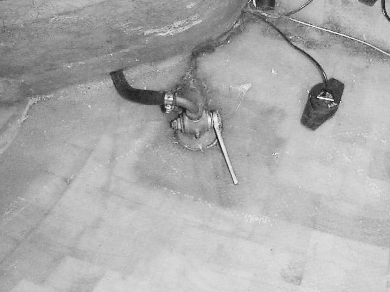 Note the dark square area around the bronze through hull fitting where the builder correctly did not use balsa core to preserve the integrity of the wood and to keep it dry. However, a depth sounder transducer was installed in the balsa cored area to the right of the bronze through hull fitting, which is not a preferred practice. However, the area was inspected using a moisture meter, and no moisture was found, indicating the balsa was still well sealed. |