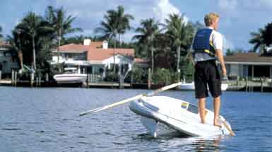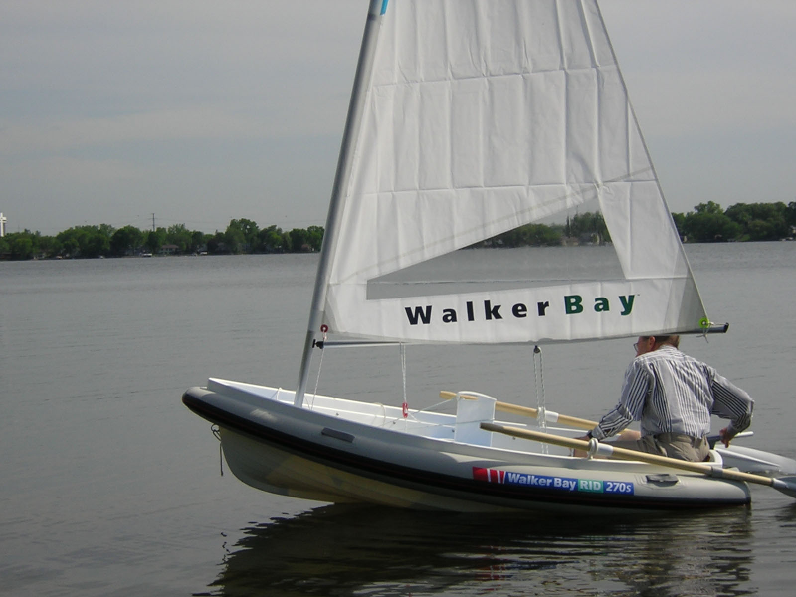 Walker bay has captured a huge share of the dinghy market since its start only five years ago. The dinghies are made of injection molded plastic and have proven to be almost indestructible. They have always rowed well and carried well for their size. Walker Bay has now added inflation tubes along the gunwales to increase capacity and appeal to a wider range of enthusiasts who are migrating to rigid inflatable dinghies and larger rigid inflatables as well. The tubes give the boats broader appeal with their added capacity for larger outboards, more gear and people and even sail kits.Walker Bay has made this transition from the molded plastic, indestructible dinghies to the rigid inflatable models the right way. You can retrofit your Walker Bay 8 or 10 to the Rigid Inflatable 270 or 310. This gives the dinghies a formidable amount of stability, not one standing on the side as pictured, not two, but three guys standing on the side without taking on water. That’s impressive in an eight foot boat of any kind. The most impressive feature from a company who could easily have obsoleted their older boats was the RID kit. All that’s required to install the kit is to drill a line of small holes along the gunwale of your current boat, install the tube track, slide on the tube, and - voila - you have a RID.