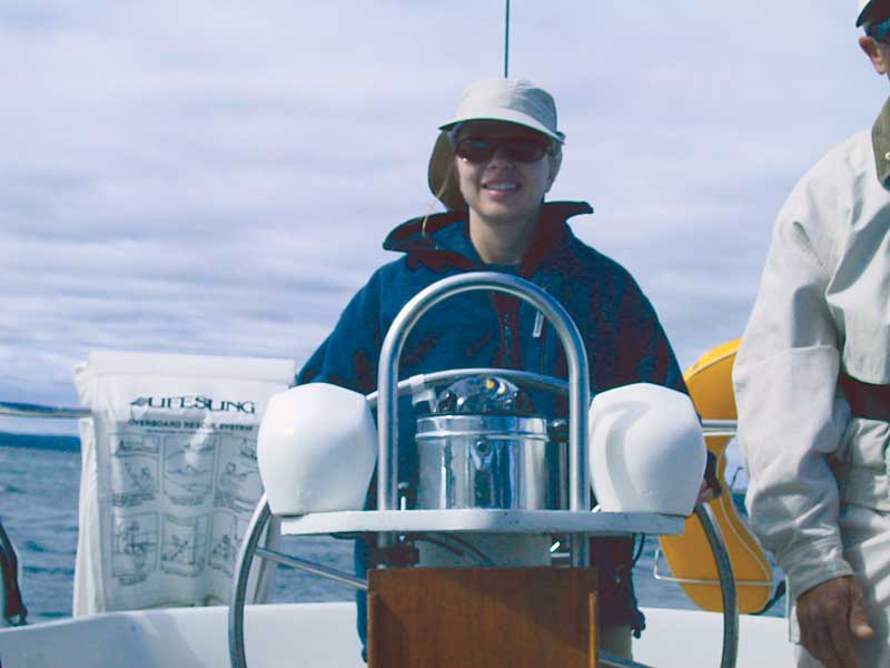 Paula Larsen at the helm sailing
