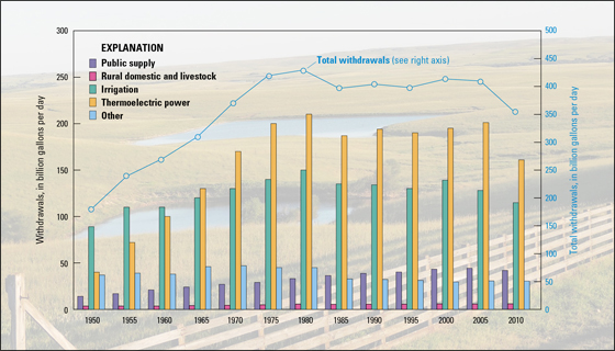 Regional water use California accounted for 11 percent of the total withdrawals for all categories and 10 percent of total freshwater withdrawals for all categories nationwide. Texas accounted for about 7 percent of total withdrawals for all categories, predominantly for thermoelectric power, irrigation and public supply.In August, USGS released the 2010 water-use estimates for California in advance of the national report. The estimates showed that in 2010, Californians withdrew an estimated total of 38 Bgal/day, compared with 46 Bgal/day in 2005. Surface water withdrawals in the state were down whereas groundwater withdrawals and freshwater withdrawals were up. Most freshwater withdrawals in California are for irrigation.