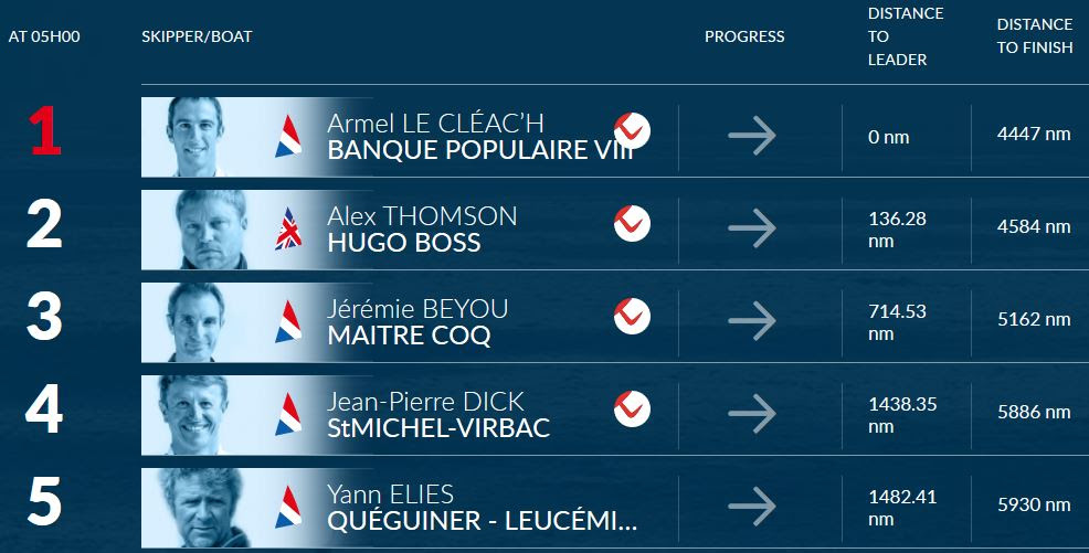 In the Atlantic, it is Yann Eliès who has had the best day on Quéguiner-Leucémie Espoir. He was the fastest of the six leading boats and has got back to within 45 miles of fourth placed, Jean-Pierre Dick on StMichel-Virbac who continues to be consistently slower. Eliès is ahead of Jean Le Cam (Finistère Mer Vent) by around thirty miles. It's been smooth sailing for Jérémie Beyou in third place with the skipper of Maître Coq gaining 70 miles on Alex Thomson, although the British sailor is still 580 miles ahead.