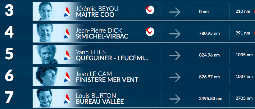 While some 200 miles from the finish Beyou is struggling to find enough breeze to complete his race , some 250 miles north east of the Azores, the three cornered battle between Jean-Pierre Dick, Yann Eliès and Jean Le Cam has seen Dick step 25 miles clear today in 20-30kts S'ly breezes. Dick has the advantage of slightly more breeze and the potential to go faster with his foil assisted St Michel-Virbac. Their race within a race which Eliès describes as their own Vendée Globe is already the first time that three skippers have been so closely matched so close to the finish. They will have to transition across a ridge of light winds before they finish on Wednesday, but the weather models suggest there might only be four hours separating fourth from sixth. Dick is looking to finish the Vendée Globe for the third time, at best equalling his fourth place in the 2012-13 edition. Le Cam finished sixth last time and his best remains second in 2004-5, while this would rank as Eliès first Vendée Globe finish. Speaking to Les Sables d'Olonne today on Vendée LIVE, Elies - who will also route through the waters where five of the six top skippers call home - said: