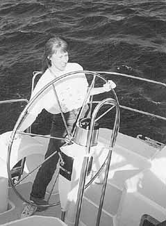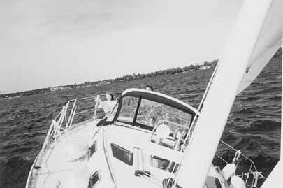 Here is where the simplicity of the rig really showed off. Not only had the reefing gone without a hitch and we were no longer overpowered, but it was so simple to tack through 80 - 85 degrees upwind. With the main adjusted, the traveler centered and the jib self-tacking, the helmsman simply tacks upwind, as often and quickly as desired. Gary moved into his coaching mode with Alexis going upwind. Within 10 - 15 minutes, he had her tacking and staying in the groove on both upwind tacks. It takes a comfortable degree of knowledge of and confidence in your equipment for a dealer to turn his boat over to a 17 year old sailing reporter and then bring her up to speed in such a short time.