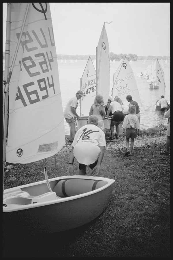 | Parents get their feet wet helping out at a T. C. Youth Sailing event. |