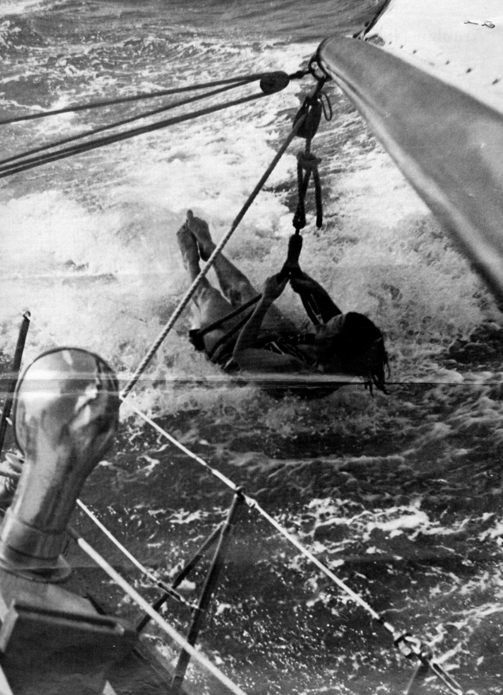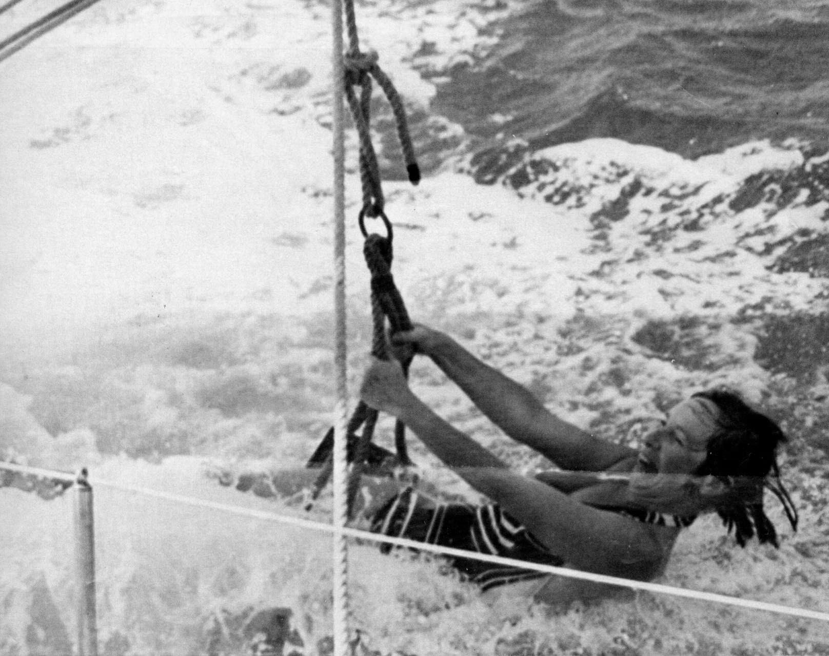 Skipper Charles Marshall developed the method of using a bosun chair to swim while under way while cruising Lake Michigan in the 50’s.