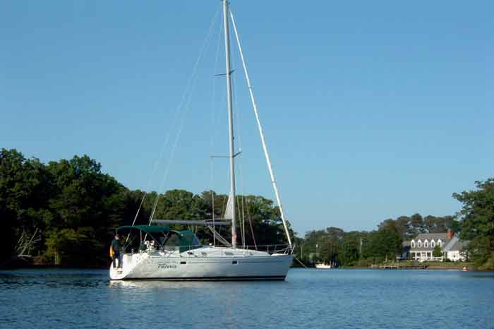 | “Victoria” at anchor in Dymer Creek, VA (picture by J. Henderson) |