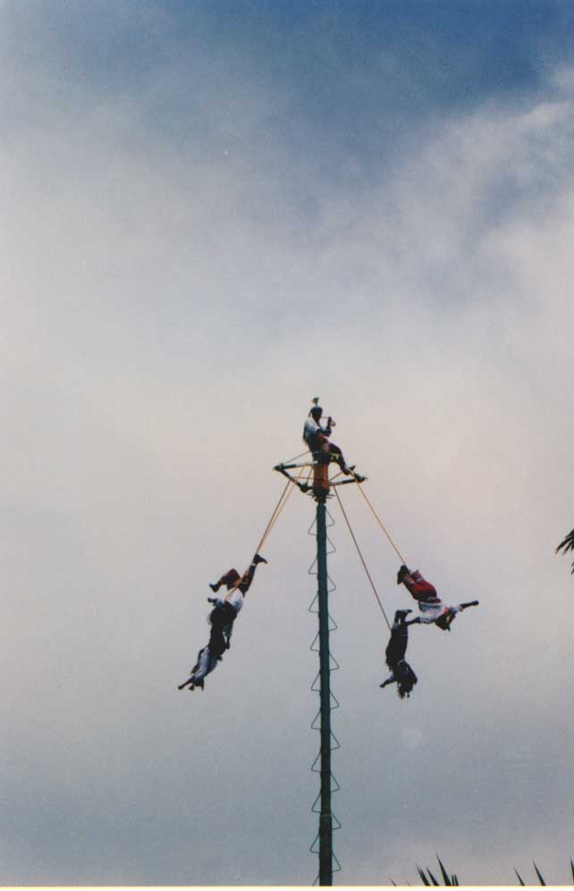 At noon we headed into town. It was Wednesday; better know to the crew aboard Out of Bounds as “malaria Wednesday.” We were on our weekly doses of chloroquine, an anti-malaria medication. Every Wednesday we took our pill and every Wednesday we felt nauseous. We barely dragged ourselves through the jungle heat into town where we sat down in the cool plaza to watch the incredible Mayan “Voleadores” or flyers. We soon forgot all about malaria Wednesday as we watched these Mayan men, dressed in traditional costumes swinging upside down from a high pole, feet attached to a rope that unwound until they finally reached the ground.