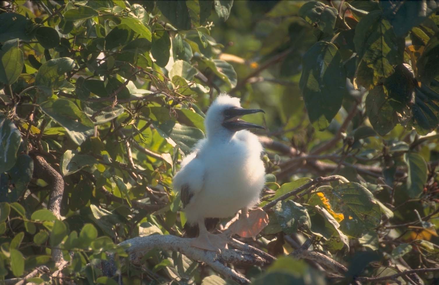 | Baby red-footed booby bird in nest in a ziricote tree. |