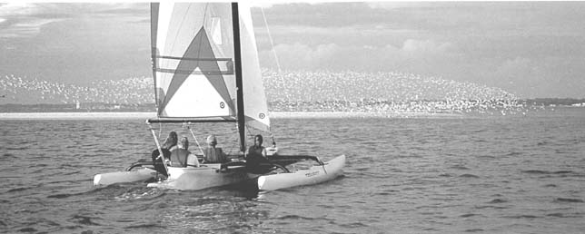 The WindRider 17 is rotomolded polyethelene which keeps the price down. All structural reinforcements are anodized aircraft aluminum. This allows the boat to be light and reasonably stiff. The amas telescope in and out with no disassembly. The nets are large, bolt roped to the hull and support optional stiff-backed seats. The center hull has an aft cockpit, the primary driving position, and a larger forward cockpit. The forward cockpit seats two and the hard seat reverses itself to face the driver.