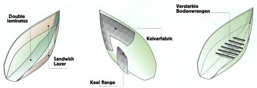Double Laminates Sandwich Layer: Sandwich Layer Keel Flange: Keel Flange Kelvar fabric: Kevlar Fabric Verstarkte Bodenwrangen: Verticle Reinforcements |