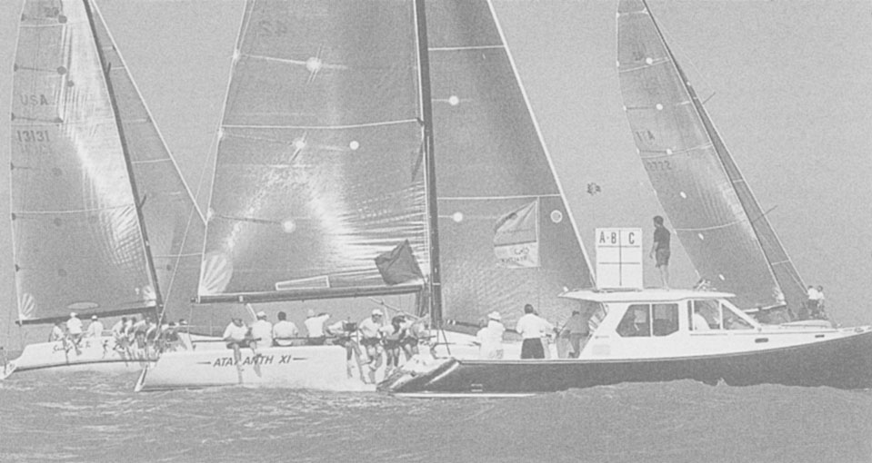 | There are two important rules of thumb for winning a tight finish, whether it’s upwind or downwind. First, finish very close to the favored end of the line. Second, ‘shoot’ the line so you cross it straight upwind or downwind. In the photo above, Far 40 champion Atalanti XI finishes a race in Key West. Assuming the near end of the finish line is favored, Atalanti has done a nice job. She is very close to this end and has luffed above closehauled to cross the line sooner. However, if the finish was really close, Atalanti could gain even more by approaching the finish on a course farther below the starboard-tack layline, so she would have room to go head to wind at the favored end. |