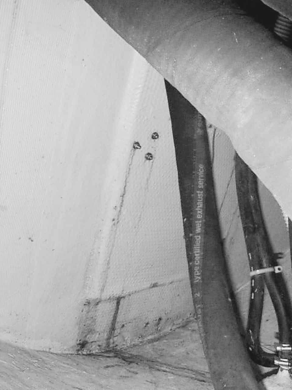 | The photo on the left is of an interior of a transom in a different 34 ft. boat, and plywood has been used as a stiffener at the center of the transom to support the backstay chainplate and boarding ladder mounts. Note how the fiberglass is raised in the area over the stiffener indicating the presence of the core material.