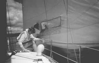 | Captain Joan (scrubbing jib) leads crew Lynn Gaardsmoe - by example. |
