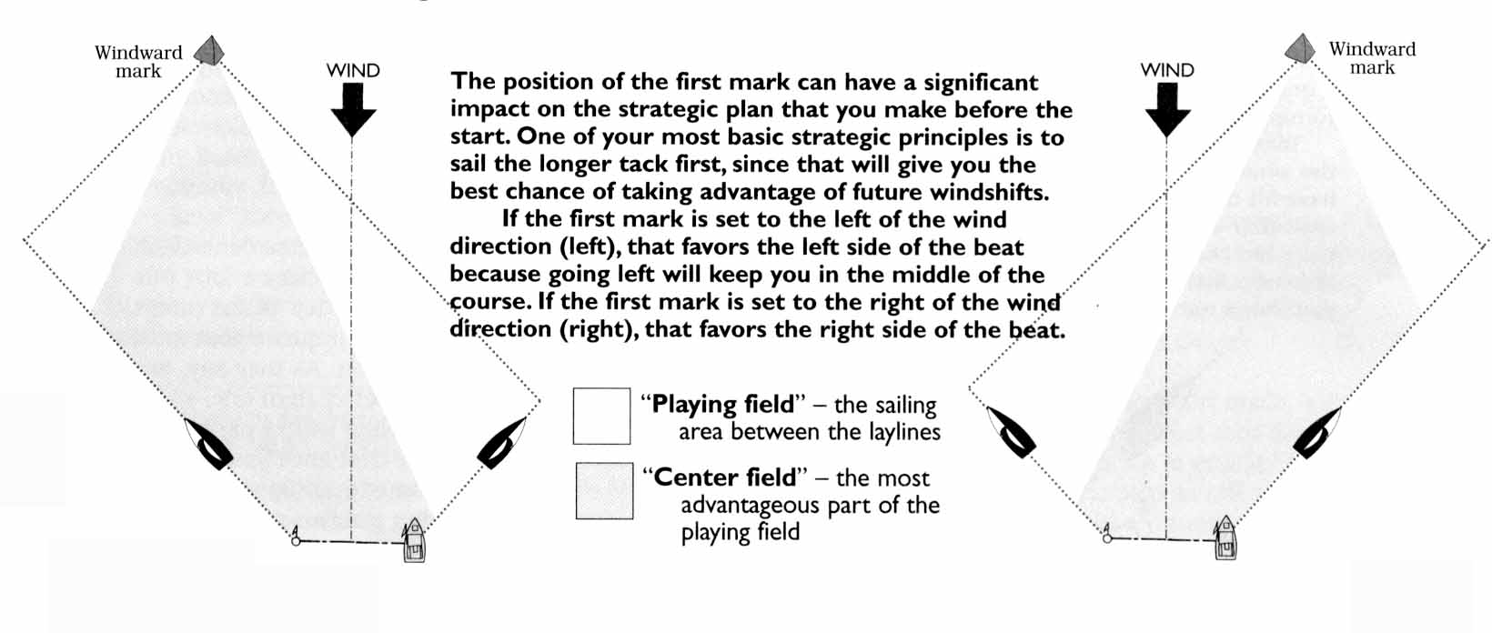 • Look at not only the bearing to the first mark, but the distance as well. The shorter the first leg, the sooner you will get to the sides of the course and hit a layline.