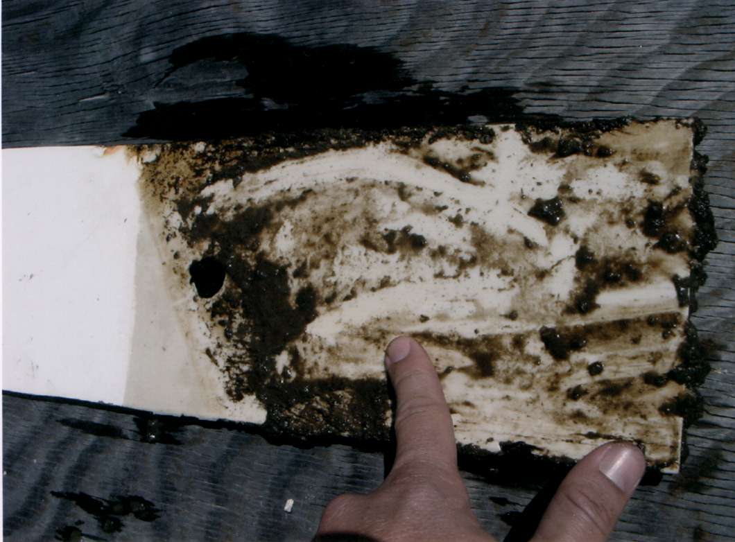 | A test panel treated with New Nautical Coatings’ experimental foul release is tested for barnacle removal. The product uses non-toxic technology to coat the bottom with a hard, extremely slippery surface. |