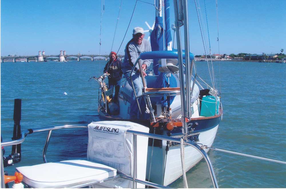 husband Scott aboard their 32-foot DownEast sailboat Chip Ahoy. After completing