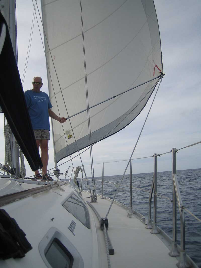 Tom Kershner holding out the Genoa in the British Virgin Islands.