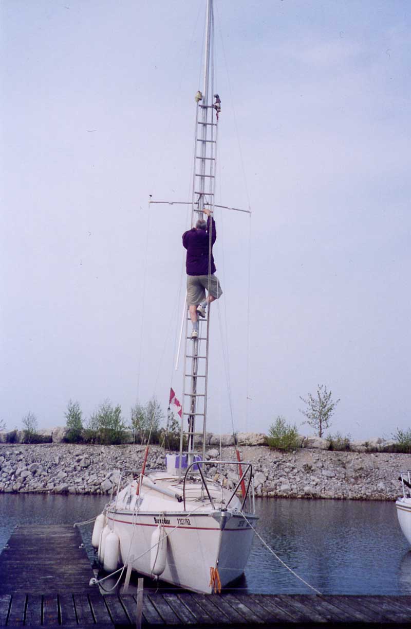 Two days later Barb and I carried my new idea out to the boat. Although Barb did not like this idea, she liked the mast winch idea even less. I decided to do this during a week-day evening, when there were fewer people about to witness my possible “misadventure.” They would probably have said that sailboats and extension ladders do not mix! I tied the base of a 24 foot ladder to the mast, tied every fourth rung to the mast as I climbed and pushed the extension up. I went through a lot of rope. At the top of the ladder and the final tie-off I realized the ladder was eight feet too short! I carefully descended and went to the chandlery to purchase a longer boat-hook. The lady behind the counter asked what I was up to. After I told her, she asked me to wait another five minutes until she closed. She didn’t want to watch or hear me fall! After I re-assured her that the water was much too cold for a swim I returned to the task at hand.