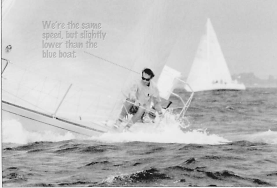 The speed reporter is as important as any crewmember for helping get your boat up to speed. Here’s how a sample running report might sound: “We’re a little higher, same speed.” “Still a bit higher, maybe faster.” “Same height now, same speed.” “Slightly lower, but speed is at least the same.” “A little lower, and now a bit faster.” “Still lower and faster, net gain to us.” “Almost the same height, a lot faster.” “Same height, still faster.” “Higher and faster.” “A lot higher, now the same speed.” “Still higher but a little slower.” “Higher and slower, net gain to him.” “Same height, same speed.” |