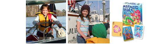 Ehlers is a Portland, Oregon native and lives with her parents and two brothers. She was inspired to create Mermaid Beach in 2007 when she and her family spent an entire year living aboard a 42-foot sailboat. “We spent several weeks sailing around Cape Cod at the start of our trip. That is where I got the idea. Because we were always on the water or in the water, I started thinking about what if mermaids were real?” says Ehlers. “We had a lot of time being on a boat, and I liked the idea of using some of it to make a new game instead of just playing the ones we already had. It was my idea to make the game about mermaids and shell collecting, but everyone in my family helped with ideas for how the game would work. My brothers Jake and Drew helped me make cards so we could play and test out the game. My mom and dad played lots of rounds with us and helped us work out the kinks.”