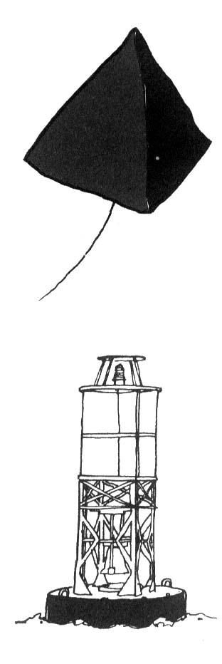 • Government buoys often mark shoal water, so beware of changes in current, running aground, and the fact that the area inside the mark may be considered an obstruction.