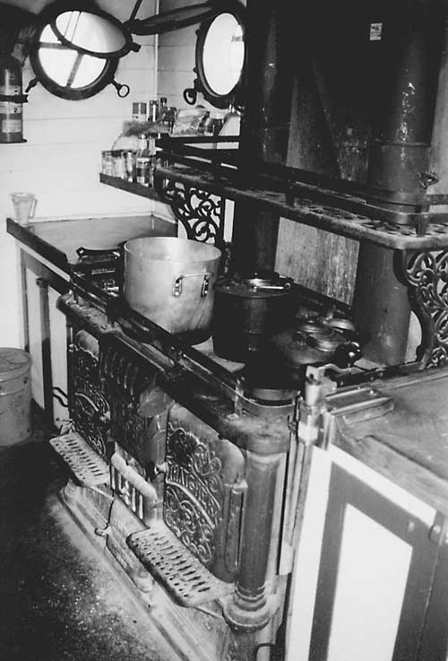 | The ship's antique cast-iron, coal-burning stove. |