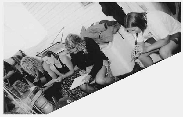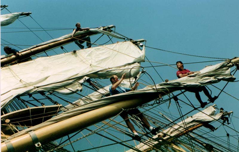 The most lasting impression of this journey is that keeping a ship in 'ship shape" is a lot of work - backbreaking, dirty, unglamorous work. Crew members are constantly swabbing decks, cleaning the head, scubbing dishes in the scullery, tarring the lines, mending the sails, and scraping and painting the masts.