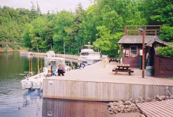 | Chip Ahoy secured at the floating dock in Black River Harbor. Depths were more than adequate, save for a shoal at the end nearest the fixed pier. |