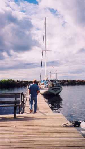 The only trick to entering the harbor is to keep well to starboard once inside the breakers. The boulder-infested shallows to your left can easily be spotted when the sun is positioned properly. We found a full house on this Friday in early July 2004, with three sailboats and local sport fishing boats occupying most of the fixed dock, a long, side-tie pier. There are 32 total slips and eight transient slips; boats drawing more than five feet should not venture beyond the boat launch.