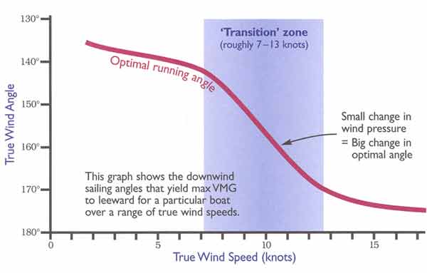 | On a run, the angle you sail to maximize you VMG to leeward depends a lot on wind velocity. In heavy air it’s fast to sail almost dead downwind, while in light air you must sail a lot higher. However, this relationship is not linear. In the lighter (under 7 knots) and heavier (over 13 knots) wind ranges, changes in windspeed have only a modest impact on your ideal sailing angle (see graph). In the middle range, however, a small increase or decrease in wind speed can change your optimal sailing angle significantly. When you are sailing in this ‘transition’ zone, you must be very sensitive to changes in the wind - otherwise you will be sailing at a less than optimal angle and speed. |