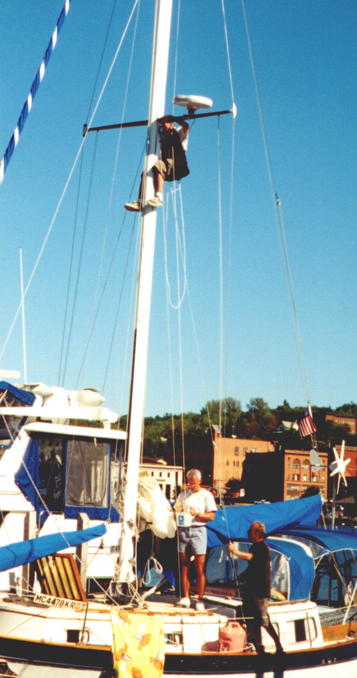 | Young Bill shinnies up the mast of a neighboring boat at the marina with dad assisting on deck. Now that he's learned the ropes - and the boson's chair - the teenager's services are coming in handy. In this instance, he removed an old TV antenna that was a favorite perch for predatory owls and checked the damage their talons wreaked on the spreaders. Not a bad way to make a little spending money! |