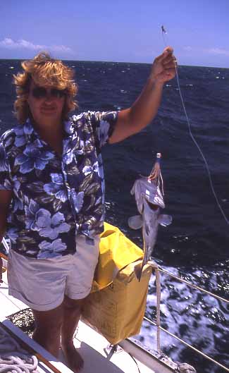 | Tom holds up a nice amberjack that we caught on the handline. |
