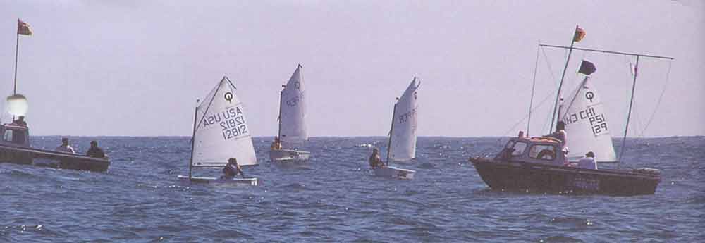 | It usually pays to finish very close to the favored end of the line (in this photo it’s the boat end on your right), but be careful when you have a committee boat there. If you cross the line too close to the boat, you may not be able to clear its bow or anchor line without tacking. Even after finishing, you can still be penalized (for touching the RC boat or fouling a competitor) until you clear both ends of the line. So when you’re in traffic, think about making a safer approach where you are sure to fetch the favored end of the line (like the second Opti from the right). |