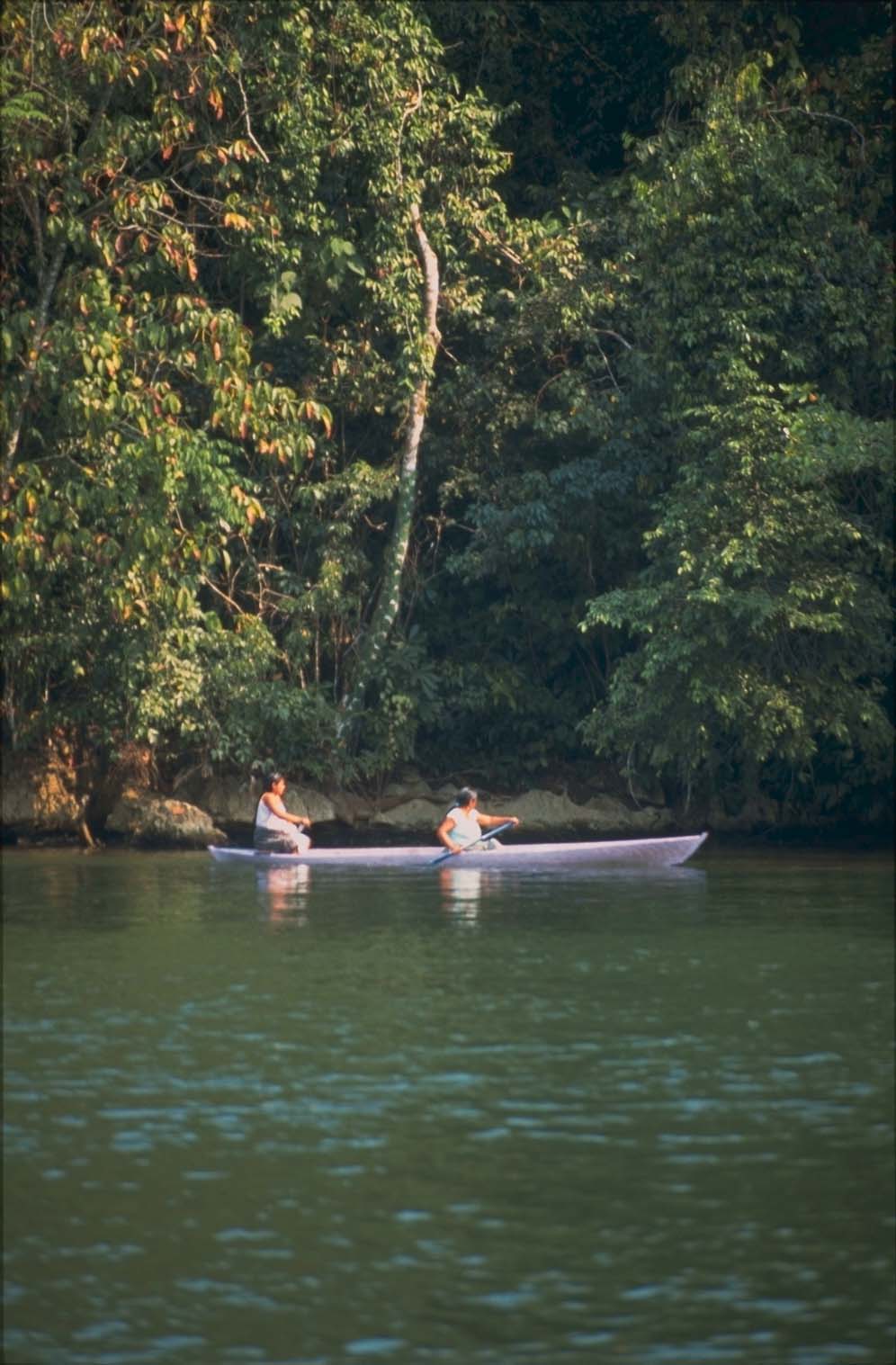 | Mayan Women paddling a cayuco (traditional dugout canoe) in the rainforest. |