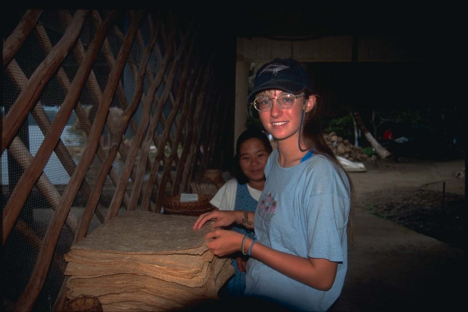 | Kate and Kenna Theisen look at handmade paper at Ak’Tenamit, a community outreach for the local Ketchi Mayan Indians. |