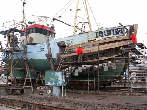 | Replacing planks at Aasiaat boatyard - copper bottom