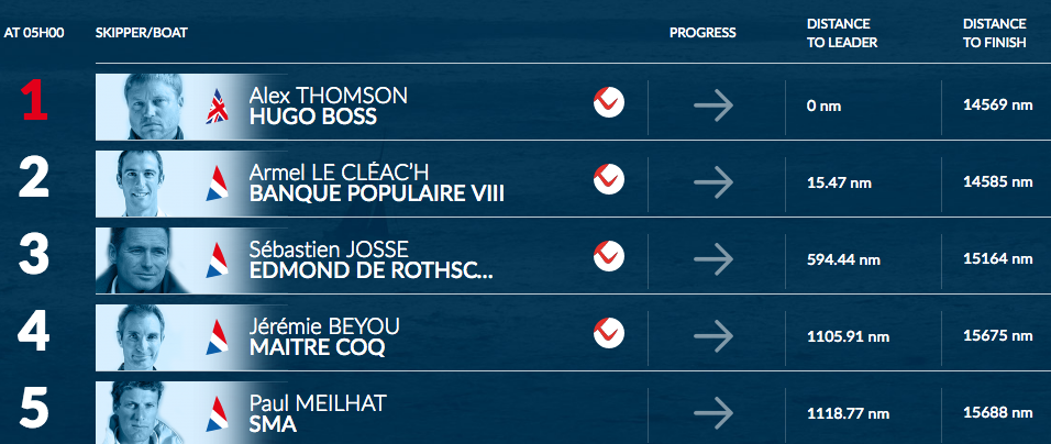 At the front of the fleet Thomson's lead has grown to 15 miles overnight as he makes the most of being on starboard tack, the one that allows him to use his remaining foil and therefore reach the full potential of Hugo Boss. Thomson was this morning making 17 knots just 12 miles from the Antarctic Exclusion Zone with second-placed Armel Le Cléac'h 15 miles to the north west. The leading duo are around 1,000 miles from Cape Leeuwin in the east of Australia, and should pass the longitude of the landmark this weekend.