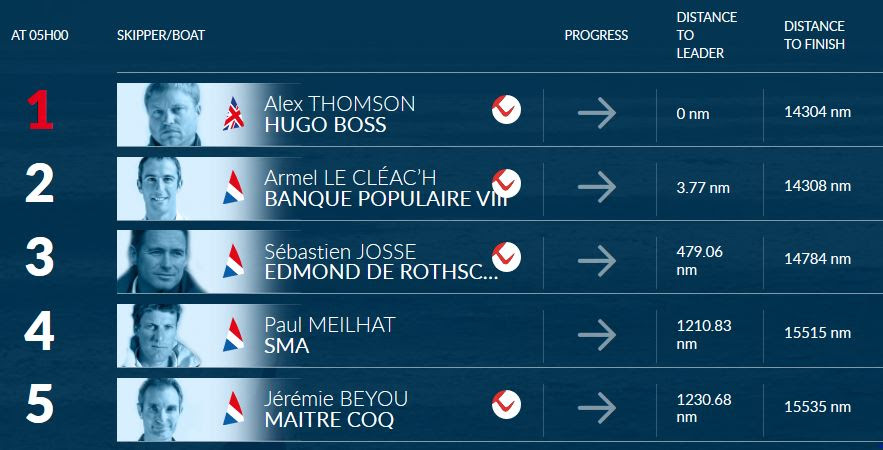 At the front of the fleet Alex Thomson made a nine gybe slalom along the ice wall yesterday over the course of 12 hours – between 0500hrs and 1700hrs before converging with his long time pace making rival Armel Le Cléac'h. The Hugo Boss skipper was clinging to a lead of less than four miles in terms of distance to the next waypoint earlier this morning, the two IMOCAs were just one and a half miles apart at some points both making around 15kts in 15-20kts of breeze on Thomson's unflavored port gybe. They are some 800 miles west of the longitude of Cape Leeuwin and about six days ahead of François Gabart's 2012-13 record pace.