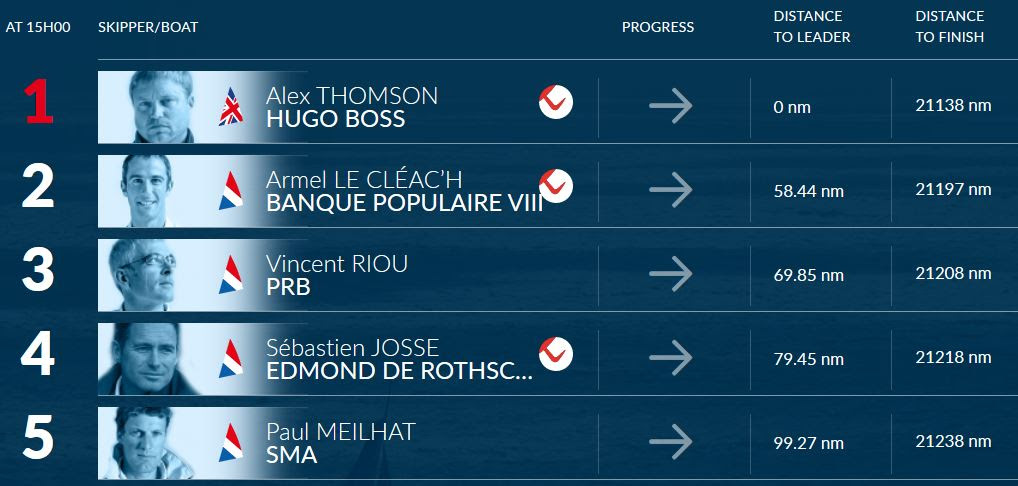 Tanguy de Lamotte was making the climb northwards this afternoon after leaving the race to get south. After breaking his mast tip and being unable to set a full mainsail and masthead headsails, de Lamotte will continue unassisted back to Les Sables d'Olonne. "I'm taking my boat home to Les Sables d'Olonne without going all the way around Antarctica, but will be continuing my campaign for Mécénat Chirurgie Cardiaque," he said.