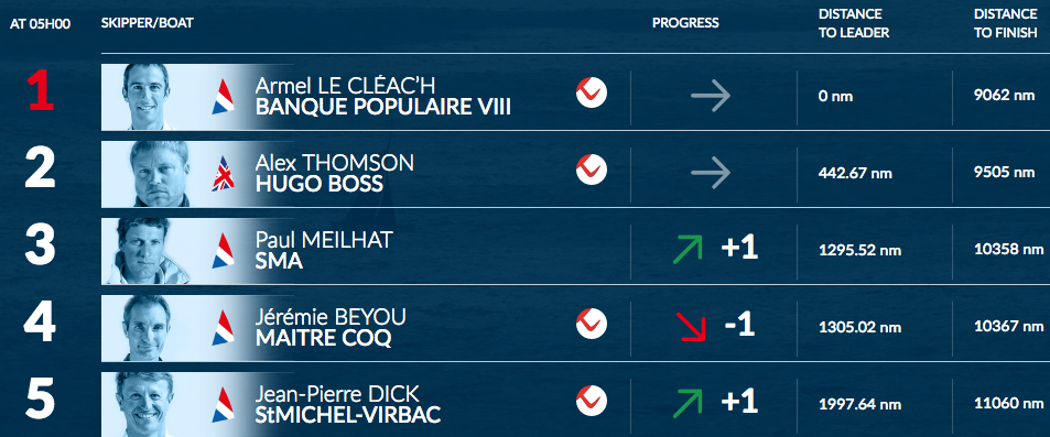 All of the skippers are making good speed on this 42nd day of racing, except for Armel Le Cléac'h (Banque Populaire VIII). As forecast, the race leader has slowed in a wind hole. His speed is down to eight knots, while Britain's Alex Thomson continues to make progress at 16 knots. We could see a slight narrowing today in the 442-mile gap recorded in the 0400 rankings. Jean-Pierre Dick (StMichel Virbac) has gained more ground in ideal conditions. Averaging 18 knots, he is now ahead of Yann Eliès (Quéginer Leucémie Espoir) by 8 miles.