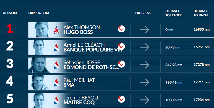 And at 0500 UTC Le Cléac'h was hitting more than 19 knots while Thomson was only mustering 11 as he attempts to transition through an area of lighter winds.