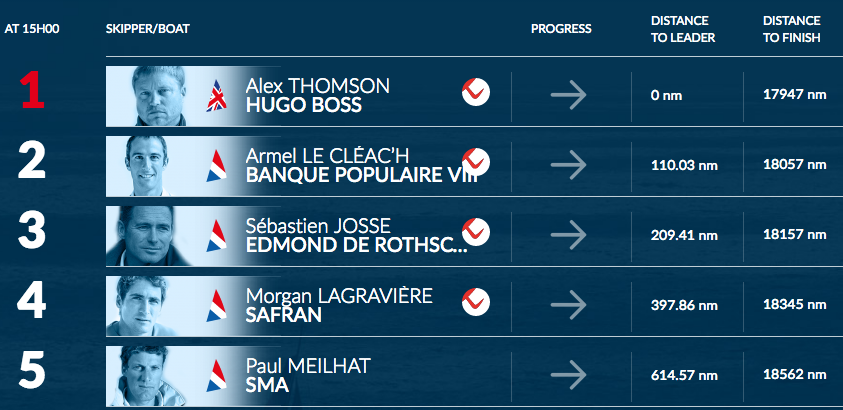 Riou is out but the race continues at breakneck pace. The leading trio have a 200-mile buffer on Morgan Lagraviere in fourth, while his rookie rival Paul Meilhat now lies 600 miles behind Thomson. Despite trailing by 1,000nm Yann Eliès is, incredibly, still in touch with the front pack in 8th place, but the big winner in the last 24 hours is Eric Bellion who has leapfrogged four places in the last 24 hours to now sit in 18th.