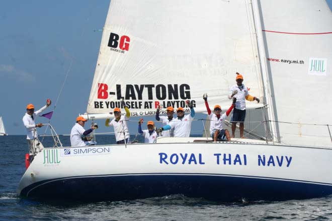 This morning there was a historic celebration at the Phuket King's Cup, a magnificent spectacle as more than 100 yachts staged a Sail Past. From a tiny Shaw six-meter sports boat to Frank Pong's magnificent maxi, a Reichel Pugh 25-metre sloop, yachts flying burgees from opposite ends of the world, from the Antipodes, across Europe, Asia to North America sailed past the bedecked Royal Thai Navy frigate. The Royal Thai Navy crew lined the deck, resplendent in white uniforms, as the passing flotilla 'Chai Yo'd' from their own decks, raising caps in salute. While the King's Birthday celebration has been a regular part of the Phuket Kings Cup event over the last two decades, this is the first ever Sail Past and it was a cherished moment for the sailing community. As Thai sailor Radab Kanjanavanit commented, 'the Sail Past really gave me Goosebumps.' Back to business then for the 101 boat fleet and it was a 'tough day in the office' for the race officers. On the windward leeward course in the Thai Beverage series sailed by the Racing, 1 and 2, Sports boats, IRC 1 and Firefly 850's, the north north easterly was at five-six knots but swung right to north east and then softened. There were patches of glass. The second race provided similar difficulties, but the third race for the Racing fleet settled in at eight-nine knots. In the Racing Division 1, Race 2, Toby O'Connell's Dhevatara Drumstick (DK46) was first from Neil Pryde's Hi Fi (Farr 52) and Paul Winkelmann's Island Fling (TP52). In Race 3 Island Fling was fast off the line and crossed the fleet on port tack but Mandrake (Nick Burns) beat her and Hi Fi. In Race 4 Dhevatara Drumstick again took the honors from Island Fling and Hi Fi. Drumstick tactician Steve McConaghy was smiling when he came ashore. 'We had a good day. Yesterday was always going to be a big boat race, as the wind died away, but today we all sailed in the same conditions. Very similar to the light weather conditions of last year, when we won. ' In Racing Division 2, Race 2, Peter Dyer's Madam Butterfly took top podium placing, with Niels Dgenkolf's Phoenix second. Jonathan Mahoney's Happy Endings, was on the podium for a second day, placing third. Happy Endings did one better in Race 3 and placed first, with Madam Butterfly second and Panic (Jeff Davidson) in third. IRC 1, Race 2 was won by Rhythm Stick, an X442 owned by Ryuji Nakata, from the Swan 55 of Andy Pape, Big A. Valdemar Bandolowski's Di Hard, a Frers 41 was third today. Rhythm Stick also won IRC Race 3, with Octopussy (Jaray Tipsuk) in second and Sita (Peter Wintle) in third. In Coutts Premier Division, Geoff Hill's Lyons 49 Strewth had a brilliant start and she took the honours from Andrew Richards' Warwick Moon Blue. Frangipani Girl, a Swan 53 owned by David Ross, finished third. Strewth was again triumphant in Race 3, this time with Nix (Nico Cortiever) and Moon Blue (Andrew Richards) filling the minor placing. In the Firefly 850 Sport Division, Marc Cudennec's Chi Machine continued her winning form to take today's race from Andrew Marshall's Pink Lady, with Roger Kingdon's Moto Inzi third. In Race 3 Chi Machine again took the top spot, from Moto Inzi and Twin Sharks (Bill Phelps). In the competitive Sports Boats Division, Race 2, Motornet (Kenichi Takahashi) again performed well to win from Just (Shuji Hagihara) and Platu (Ket Manghlaseranee). In Race 3 Motornet continued on her winning way, with Vino (Phil Wardrop) and G4S Somtam Express (Scott Duncanson) in third. Today was the Mom Tri's Boathouse Race for the Multihull 1 and IRC 1 and Sunsail One Design fleet, which sailed a 15 mile course, while the Multihull 2, Bareboats, Ocean Rover and Classic fleet sailed an 11 mile course. While the start breeze was more than six knots, the fleet parked for a while near the first mark as the wind went from north east round to west north west and lightened off to four-five knots, with patches of glass. Out in the distance, it seemed a storm might be building off Karon Beach and when new pressure came in up to ten knots, the back of the fleet languished for some time. The last leg was meant to be a shy reach but ended up as a square run in seven-ten knots of breeze. In IRC 2 Race 2, Minx (Rob Taylor) was first, from Next Page (Peter Forbes) and Royal Thai Navy 1 (Lt Peera Sagultem). Ocean Rover Division Race 2, Calypso JJ (Geoff Wilson) won from Rainbow Dream (Simon Piff) and Festina Lente (Roy Ellad). Multihull Racing Division, Seekronghuk, Tim Milner, won on corrected handicap from Philip Day's The Sting, with Radab Kanjanavanit's Cedar Swan third. In the Performance Multihull Division Race 2, Gone with the Wind (Liam Nichols) won from Raimon Land Chameleon (Chris Runnegar) and Ambre (Alfred Poulsen). In the Bareboat Charter Division Race 2, Amadues (Masakido Kato) took the honours today from Bintang (Maddern and Blankly) with Fidgi (Naoki Wada) third. In the Classic Division Race 2, Argo (Brendon Baumeister) won from Jubilaeum (Mathew Harsley). Princess Athena (Antonio Escribano) today won the Sunsail One Design division from Princess Isabella (Keith Harding) and Princess Christina (Robert Yeltes). All results are provisional and subject to protests currently underway. Final full results will be available at www.kingscup.com Tonight there will be a candle light ceremony on Kata Beach, with sailors and the Phuket community in attendance, part of the national celebration which will be televised nationwide. Tomorrow's Kata Group Andaman Sea race is scheduled to be the longest passage race of this week's regatta, provided favorable sailing conditions hold for the long haul. However there is a possibility that the conditions may in fact be very light. In contrast, the typhoon currently off Vietnam may influence the regatta later in the week. This year's Phuket King's Cup Regatta will be sailed over five days, in the first week of December to coincide with His Majesty the King's birthday on December 5. The principal spons