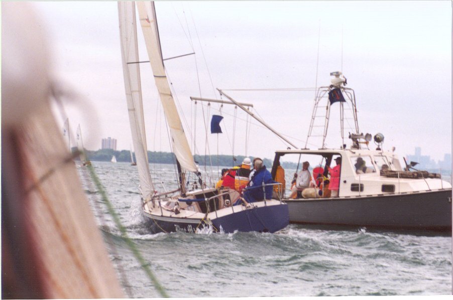 | Sarah Deeds on Mast. | Blue Max by Committee Boat. |